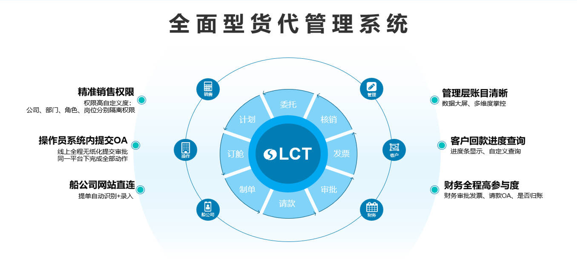 订单管理,报关管理,报表管理,财务管理,可实现电子单据识别导入,业务流及货物信息动态电脑端、手机端实时在线跟踪,相关上下游端口开放并可与第三方平台对接,财务软件数据对接,管理报表定制。